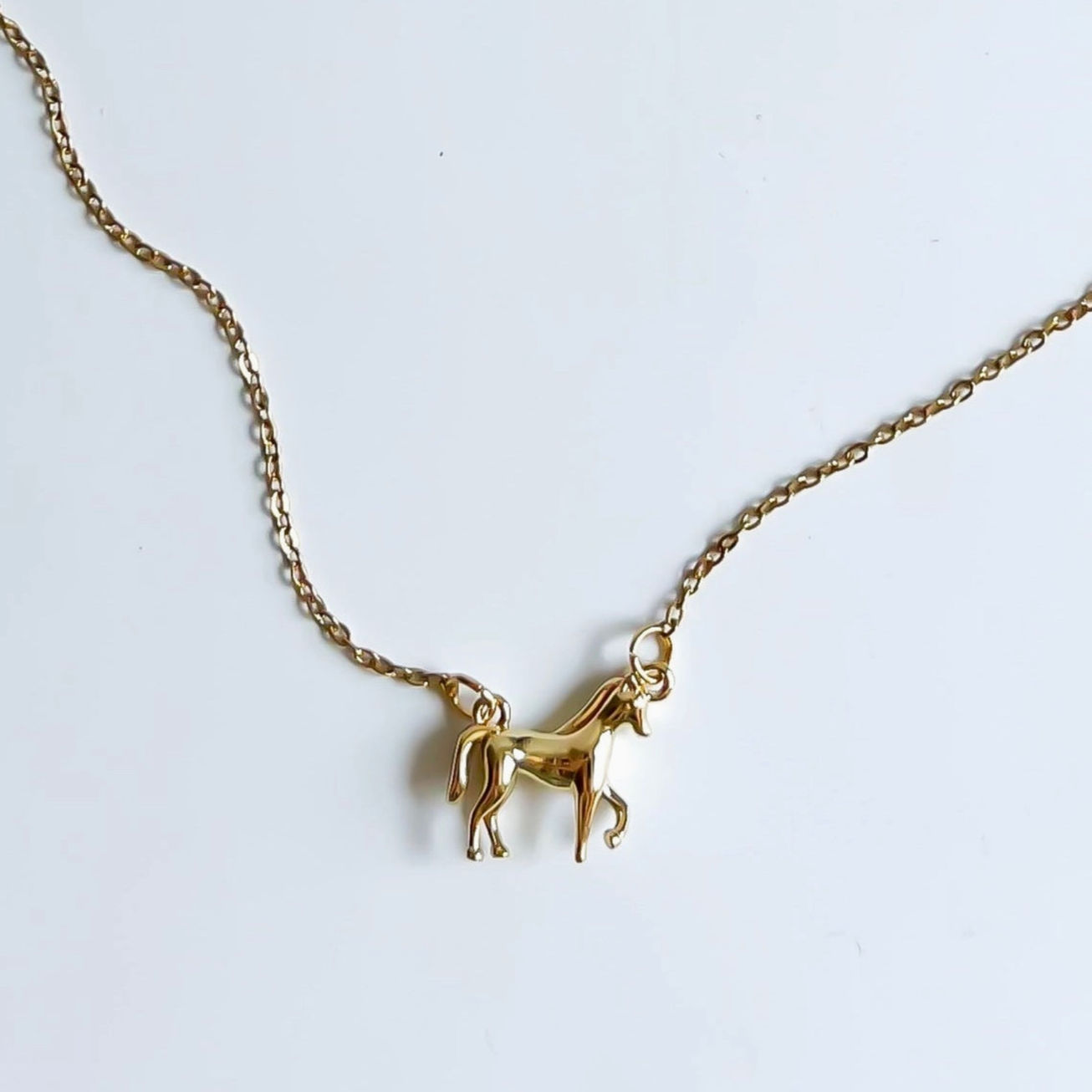 The Horse Girl Necklace features a finely crafted 14k gold-plated brass horse pendant, paired with a durable 18-inch gold stainless steel chain with a lobster claw clasp.