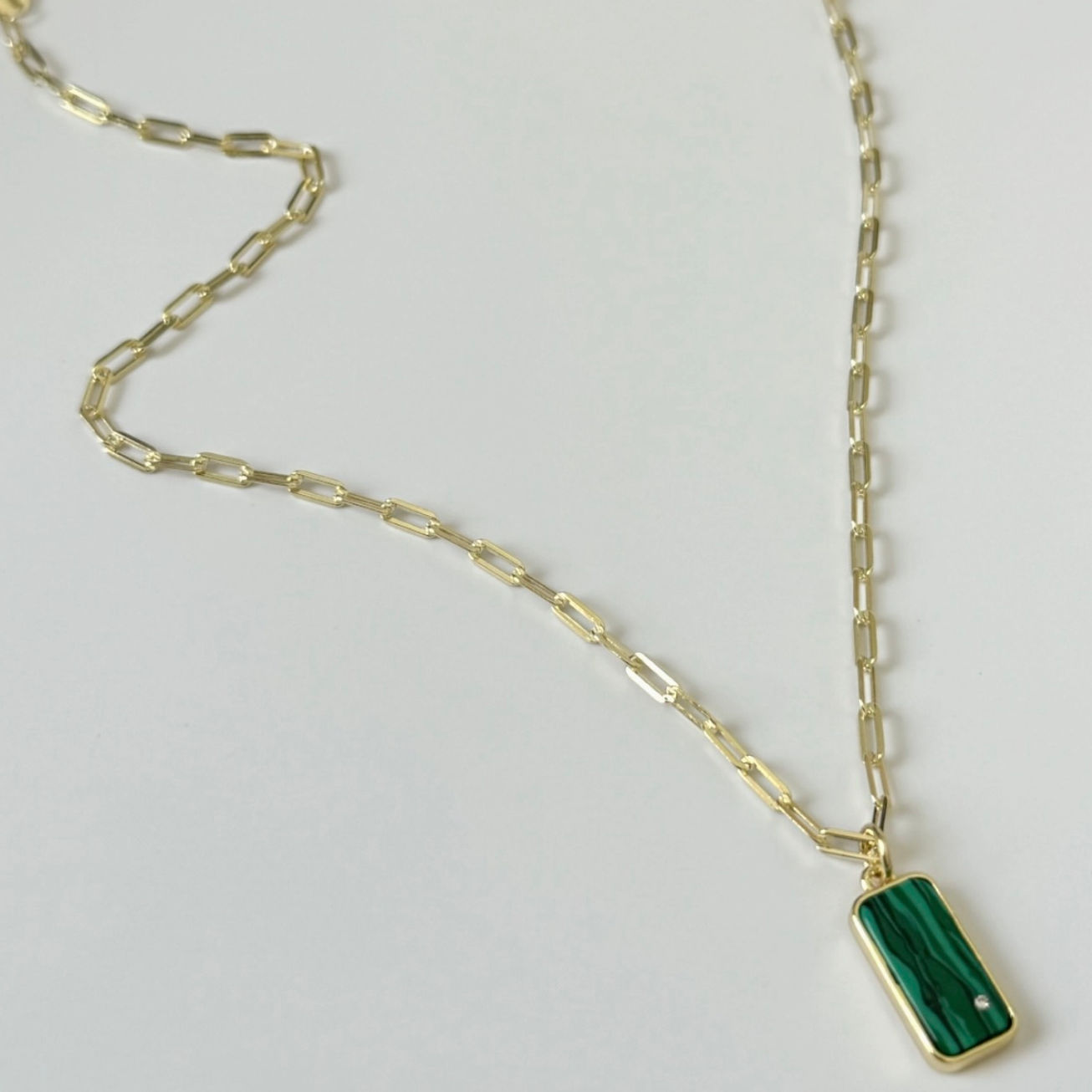 925 sterling silver gold vermeil plated staple chain necklace. Featuring green malachite charm with clear dainty cubic zirconia. Measures 18” long.