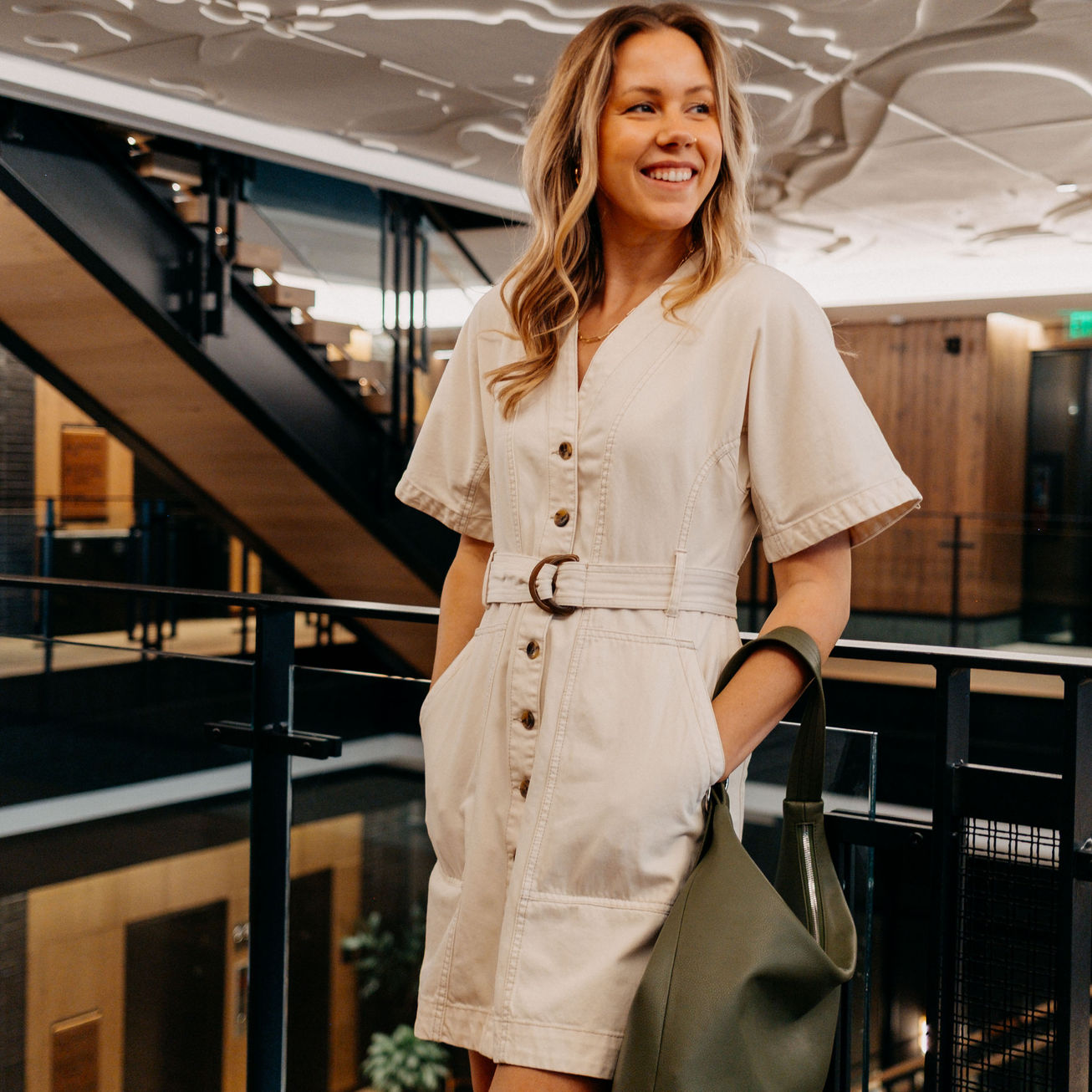 The Kaulana Dress is a denim mini dress with button front closure that embodies effortless style and versatility. Crafted from a comfortable blend of 70% cotton and 30% lyocell, it features tortoise shell buttons, an adjustable belt, and practical pockets for everyday ease. Its short sleeves, V neckline, and contrast stitching in taupe add subtle, thoughtful details that highlight your unique style.