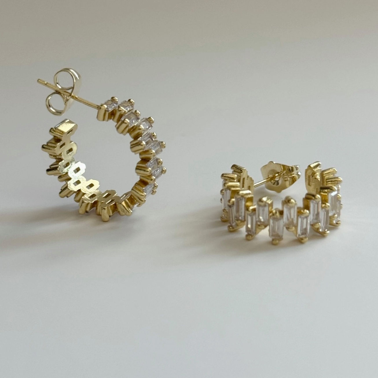 The Lalus Hoops are 14k gold filled hoop earrings embedded with small baguette clear cubic zirconia stones.