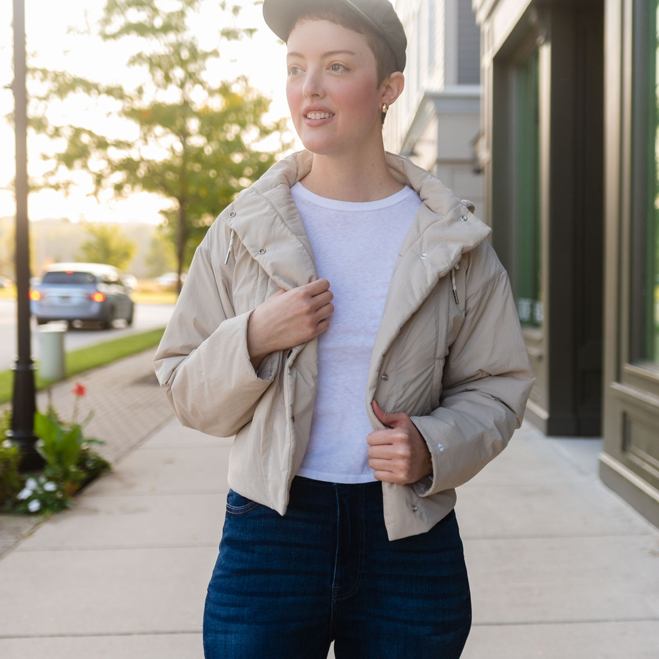 Discover the perfect blend of style and functionality with our Lightweight Jacket in Ash. Crafted from 100% nylon, this cropped lightweight jacket features convenient pockets and a secure snap button closure, making it both versatile and chic. Designed to fit true to size, it effortlessly complements your unique croft. The removable hood adds a touch of adaptability to suit any weather or occasion, reinforcing its practicality.