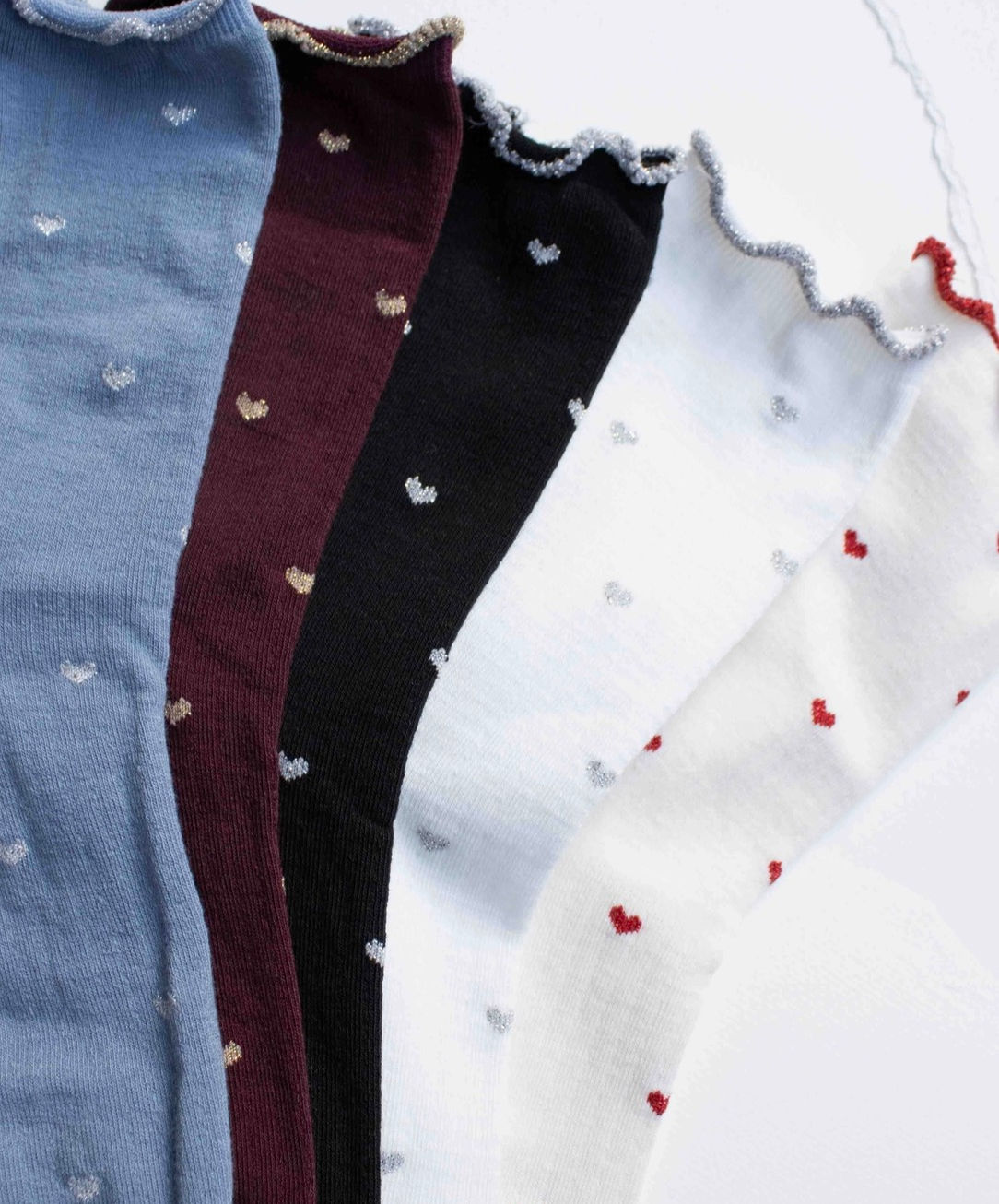 Sweet and stylish, our Mini Heart Ruffle Socks are designed with dainty heart patterns and a playful lettuce-edge trim. Made from a soft cotton blend, these socks are lightweight, stretchy, and comfortable enough for everyday wear, while the delicate details add a feminine touch.