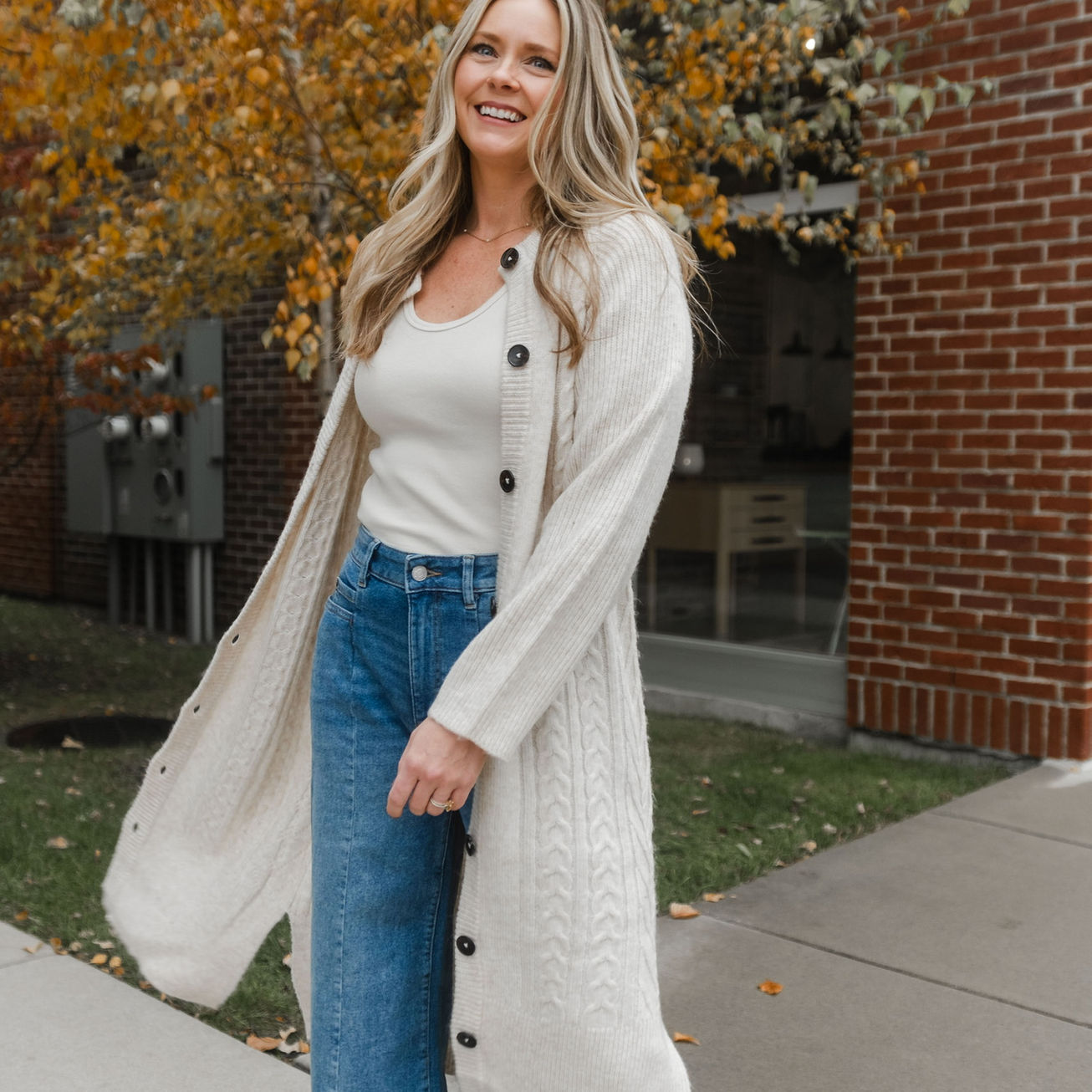 Elevate your wardrobe with the Nello Cardigan. This duster length cardigan, in a versatile oatmeal color, features a relaxed fit and classic cable knit, making it a timeless addition to any outfit. The button front closure, ribbed detailing, and side slits ensure both comfort and chic appeal. Crafted from a blend of 35% recycled polyester, 33% polyester, 25% acrylic, and 7% wool, it is true to size for a perfect fit.