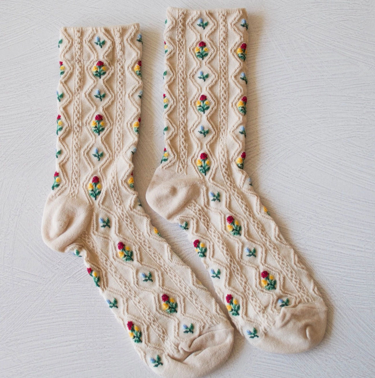 Our Romantic Floral Socks in Milk Tea feature a vintage inspired dainty floral pattern in a comfortable cotton blend. Perfect for everyday wear and fits most shoe sizes. Comprised of 80% Cotton, 10% Spandex, and 10% Polyester.