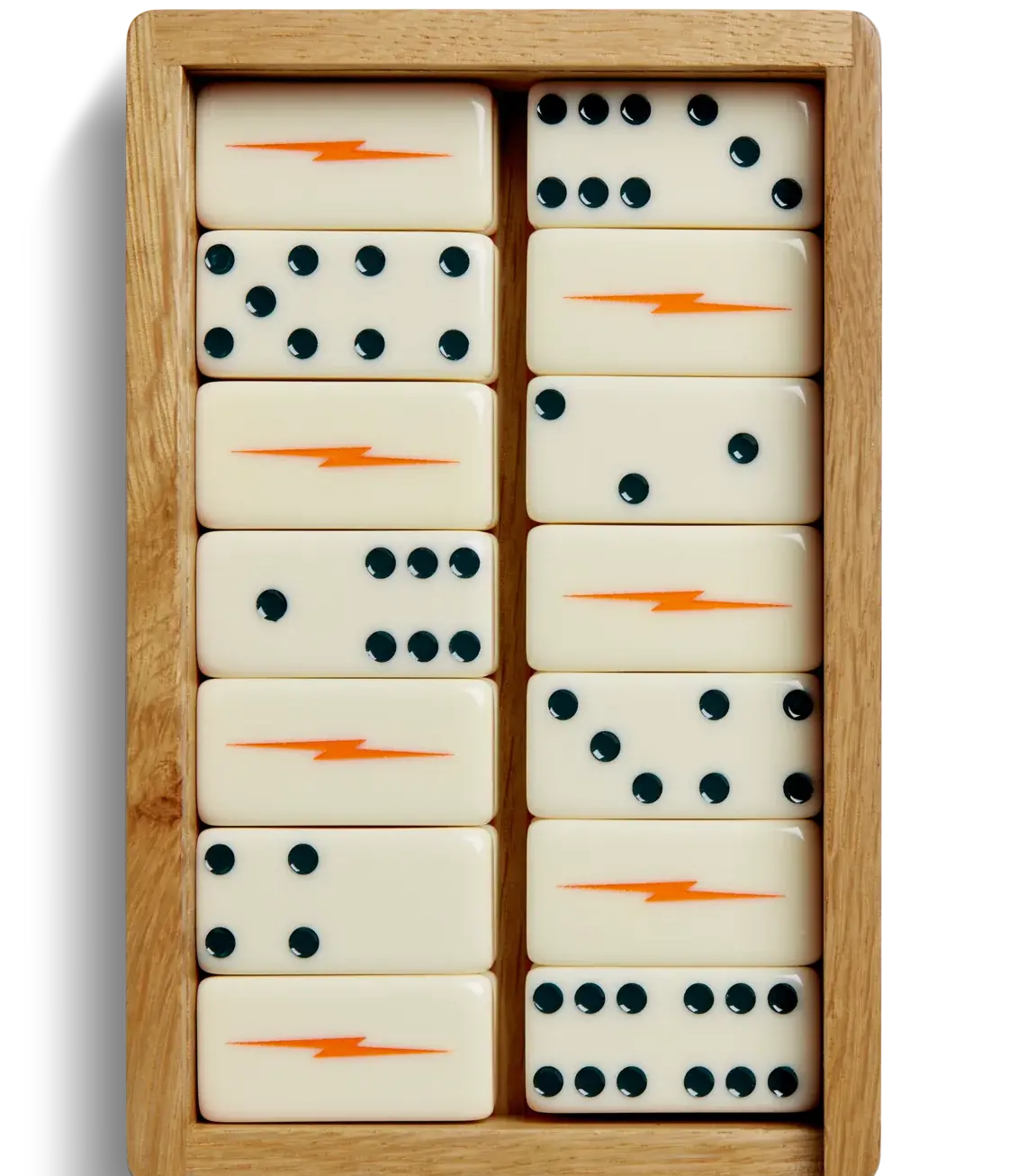 Discover the timeless elegance of the Shinola Dominoes Set. Packaged in an oak box with a sliding steel lid with powder coat finish, each ivory resin domino is hand poured and features hand-painted navy pips. Turn the tile over to reveal the signature Shinola lightning bolt, adding a touch of sophistication to your game nights.