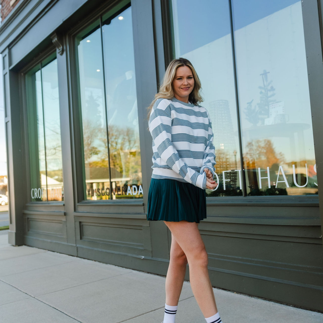 Experience the perfect blend of comfort and function with the Stripe Pullover in Forest. This pullover features a relaxed drop shoulder silhouette and is made from a moisture-wicking, anti-bacterial Pique Stripe Knit. Enjoy the quick-drying, anti-odor benefits of our 50% polyester, 50% cotton blend. For a complete look, pair with our Pleated Skort in Forest. Runs true to size and aligns seamlessly with your unique style and life.