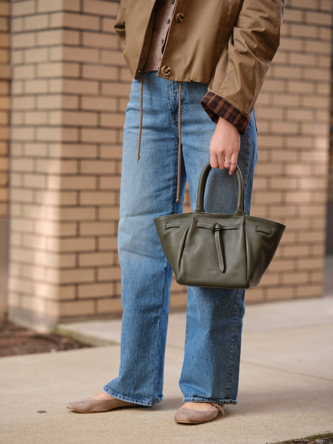 The Warmi Carryall Bag in Olive: defined by a hand-tied leather knot at the front and built to carry two ways: by hand or crossbody with its detachable strap. Handcrafted in Buenos Aires from full-grain Argentinian leather, the highest quality cut, its surface deepens and gains character with every use. Sleek and compact, it holds your daily essentials in a zippered, cotton-lined interior with an internal pocket for smaller items. A bag that moves with you, however you choose to carry it.